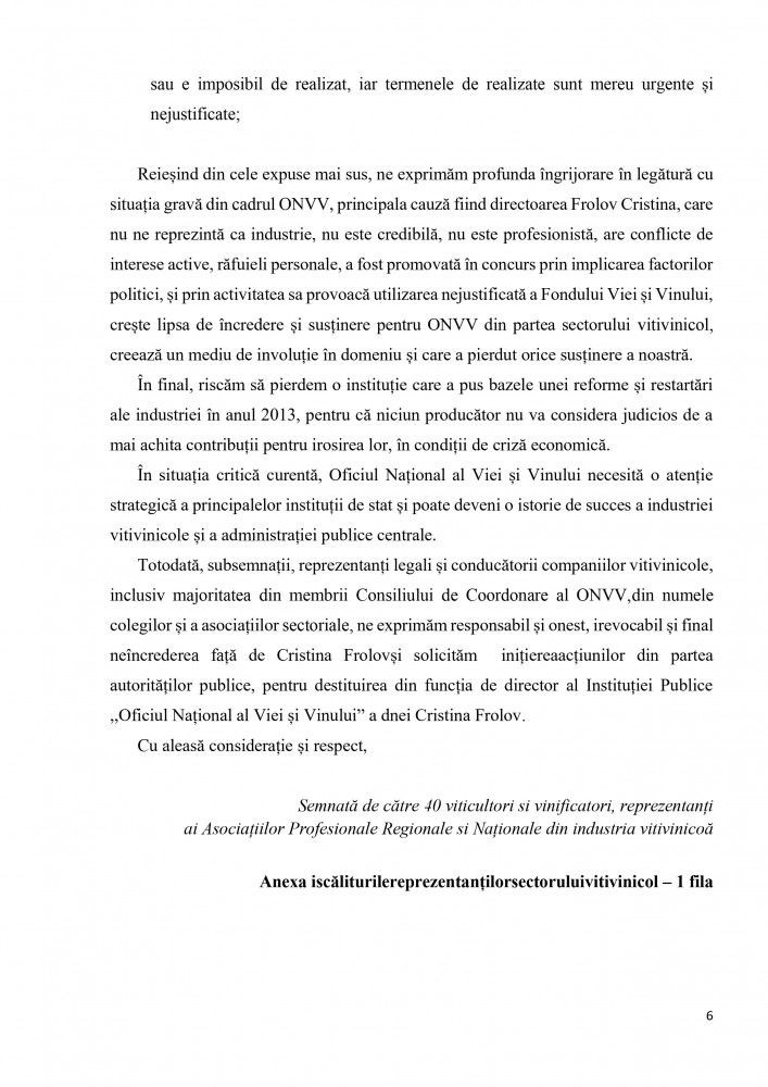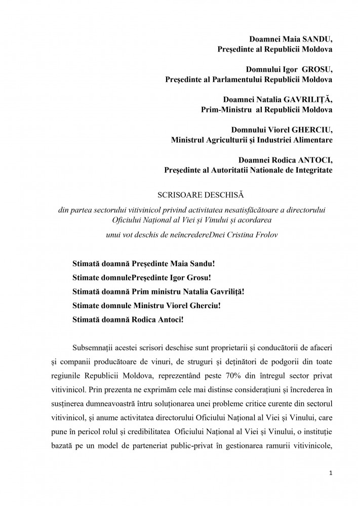 Primul pas în acest sens, potrivit semnatarilor scrisorii, trebuie să fie demisia Cristinei Frolov. ”Atenția strategică din partea principalelor instituții de stat față de Oficiul Național al Viei și Vinului, dar și revizuirea Legii viei și vinului pot crea o nouă istorie de succes pentru vinificația din Moldova”, se subliniază în scrisoare.