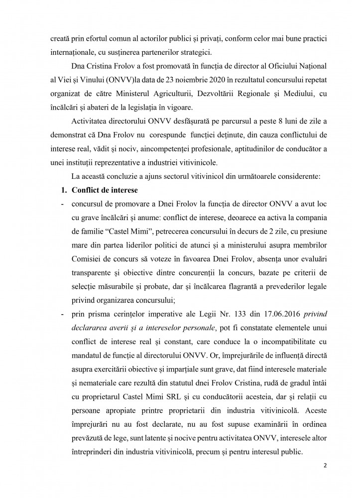 Semnatarii subliniază că Cristina Frolov, numită de Ministerul Agriculturii în funcția de director în decembrie 2020, nu avea dreptul de a conduce Oficiul, în primul rând, din cauza existenței conflictului de interese. Până la numirea sa, ea a activat în afacerea de familie ”Castel Mimi” și este rudă de gradul I al proprietarului acestei companii. Directorul ONVV, conform statutului, are acces la informații confidențiale ce ține de participanții pieței și în caz de existență a conflictului de interese, plasează o companie în poziție preferențială față de alți agenți de pe piață. Vinificatorii mai arată că, pe parcursul ultimilor luni, ”Castel Mimi” a folosit deja informația confidențială a Oficiului pentru promovarea intereselor sale private. Sectorul o acuză pe Cristina Frolov, care trebuie să reprezinte întreg sectorul, de atitudine lipsită de respect față de reprezentanții sectorului privat, pe care îi consideră concurenți, cu toate consecințele ce derivă de aici.