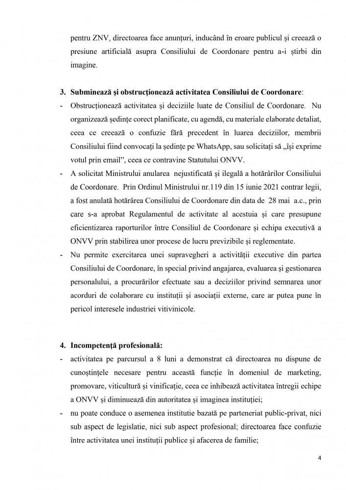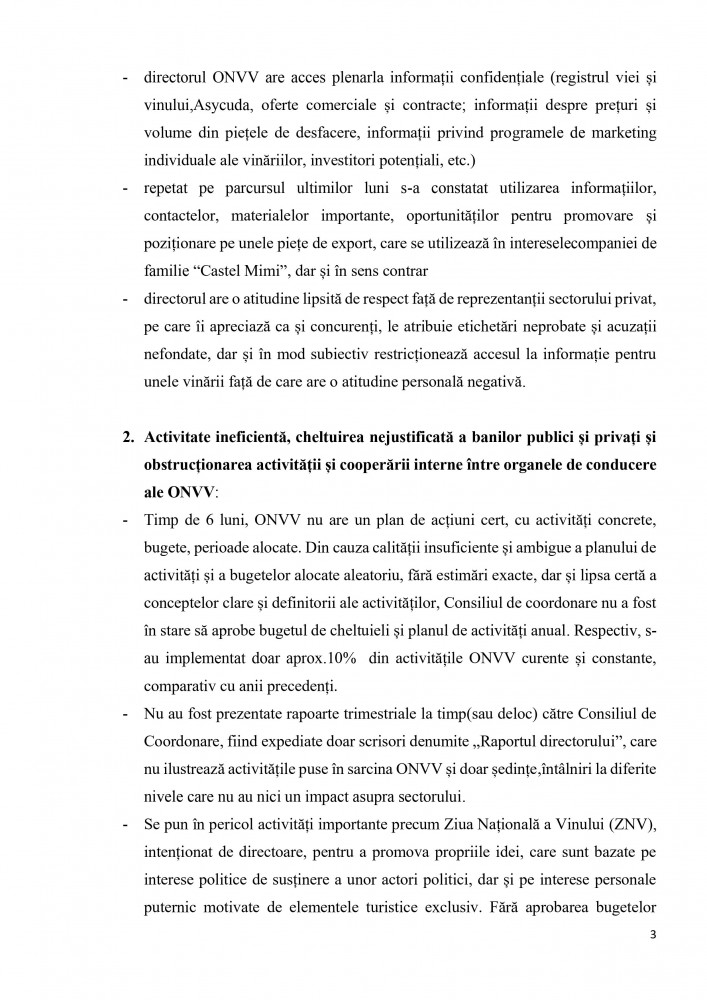Vinificatorii acuză șeful Oficiului de faptul că, timp de 6 luni, organizația nu are un plan de acțiuni de organizare a evenimentelor, nu are bugete stabilite. Din această cauză, dar și în lipsa rapoartelor trimestriale, Consiliul coordonator al ONVV, compus din 13 persoane, nu a fost în stare să aprobe bugetul și planul anual de afaceri, iar pe parcursul a 8 luni din 2021, au fost realizate numai aproximativ 10 la sută din activitățile curente și permanente ale Oficiului.