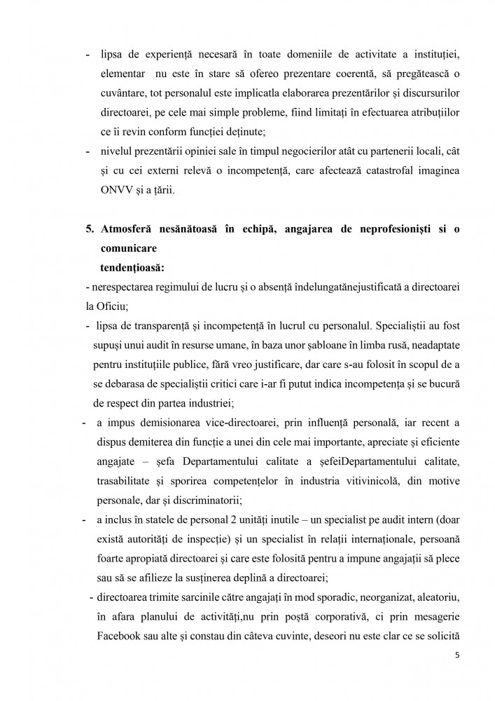 În scrisoare se menționează că în cadrul Oficiului s-a creat o atmosferă nesănătoase din cauza comportamentului directorului. Ea angajează neprofesioniști, disponibiliză nejustificat specialiști apreciați de sector, umflă statele de personal ale Oficiului din contul intereselor personale, nu respectă regimul de lucru, deseori lipsește nemotivat de la locul de muncă, îi forțează pe oamenii incomozi să plece.