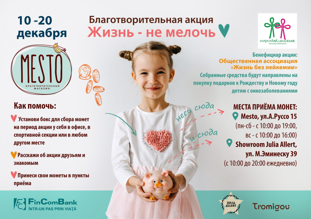 В этом году собранные монеты также будут переданы Общественной ассоциации «Viața fără leucemie». Это союз родителей, чьи дети прошли через трудности лечения онкозаболевания. Организация приобретет подарки, о которых мечтают маленькие пациенты детских онкологических отделений.