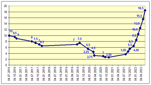 Динамика базисной ставки НБМ (по датам изменения) в 2016-2022 гг.